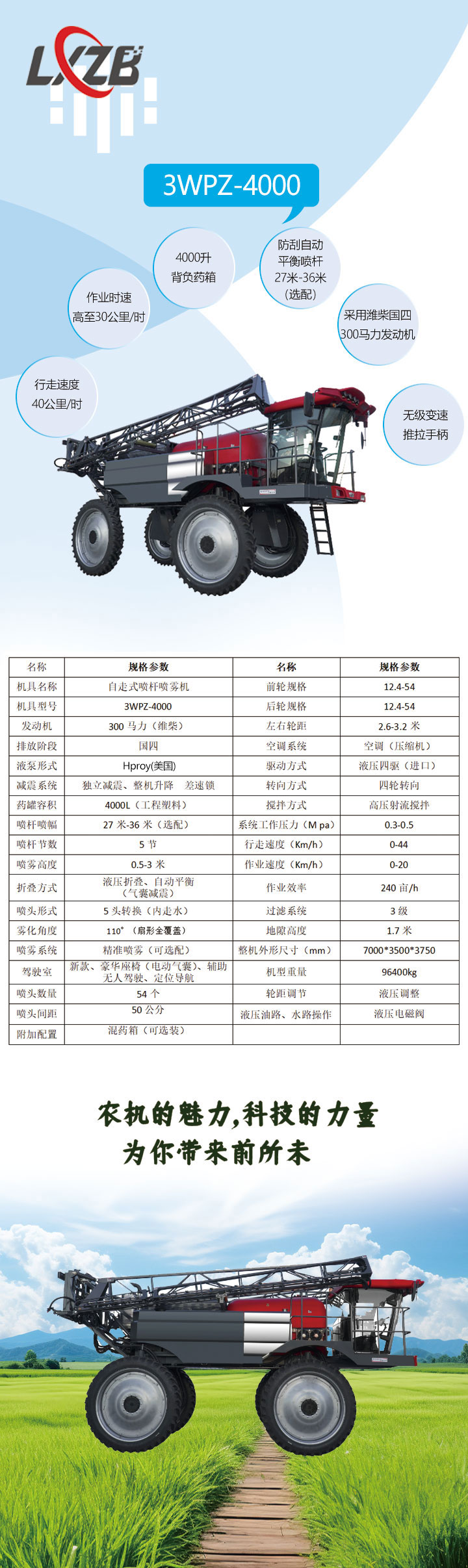 3WPZ-4000噴藥切頂及一體的全液壓噴桿噴霧機(jī)。這款機(jī)器行走速度可達(dá)40公里每小時(shí)。作業(yè)時(shí)速可達(dá)30公里每小時(shí)。 3WPZ-4000這款車(chē)搭配4000升背負(fù)式藥箱;30米防刮氣囊減震噴桿,搭配5頭轉(zhuǎn)換進(jìn)口噴頭。 此機(jī)型采用濰柴國(guó)四排放標(biāo)準(zhǔn)300馬力發(fā)動(dòng)機(jī),ACE757升流量進(jìn)口泵,輪邊液壓驅(qū)動(dòng),進(jìn)口液驅(qū)系統(tǒng)由PMP公司配套以及售 后。經(jīng)過(guò)長(zhǎng)時(shí)間高負(fù)荷測(cè)試,液驅(qū)方案可靠性較強(qiáng)。 該車(chē)搭配四輪獨(dú)立懸掛,減震效果非常出色。駕駛感舒適,大程度降低故障率。適合全地形作業(yè)。 配備兩把差速鎖:強(qiáng)制四驅(qū),提高防陷能力。該款機(jī)器配備底盤(pán)升降功能,整機(jī)可以升高0.4米。從16米升高至2米 底盤(pán)升降與獨(dú)立懸掛和差速鎖的搭配使用。讓這臺(tái)機(jī)器實(shí)現(xiàn)了全地形,全作物,全區(qū)域無(wú)差作業(yè)。 無(wú)級(jí)變速推拉手柄操作行走非常簡(jiǎn)單。整車(chē)全部功能都可以在扶手箱電控按鍵進(jìn)行操作。 增壓駕駛室寬敞明亮,保護(hù)駕駛員安全。配備豪華氣動(dòng)懸浮座椅,副駕駛位。 智能車(chē)載系統(tǒng)可以清晰顯示油溫水溫轉(zhuǎn)速等基本信息并且搭配進(jìn)口智能?chē)婌F系統(tǒng)。