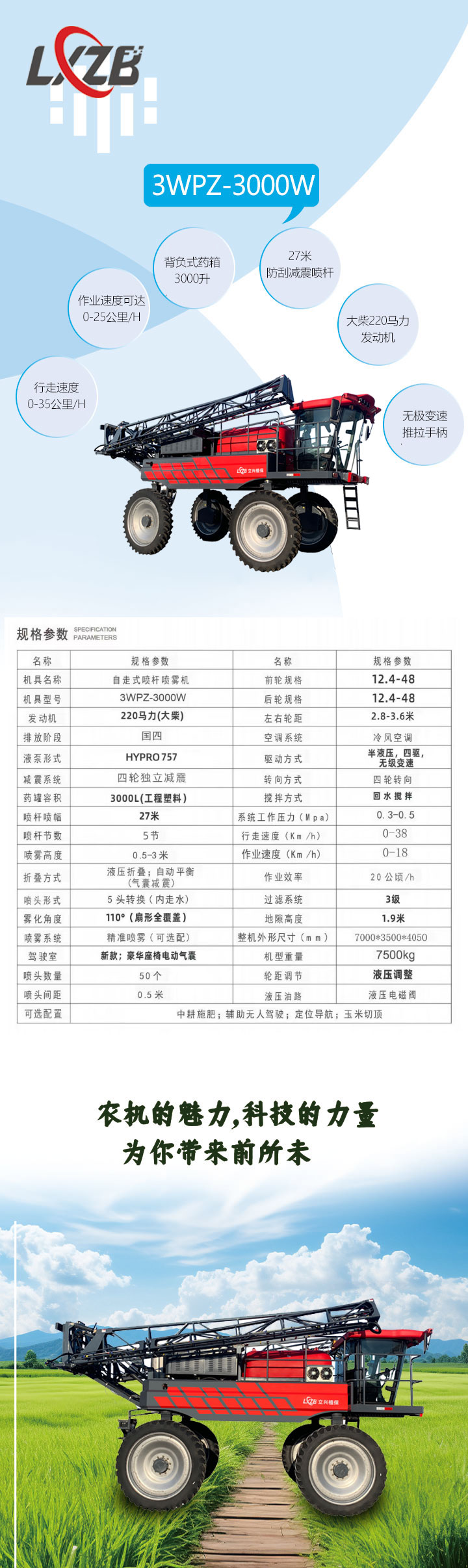 3WPZ-3000W噴藥切頂及一體的噴桿噴霧機(jī)行走速度可以達(dá)到0-35公里/H。作業(yè)速度根據(jù)作業(yè)條件可達(dá)0-25公里/H3WPZ-3000W搭配3000升的背負(fù)式藥箱;27米防刮減震噴桿,配備自動平衡功能。五頭轉(zhuǎn)換美國噴頭。此機(jī)型采用錫柴國四排放標(biāo)準(zhǔn)220馬力發(fā)動機(jī)。噴藥水泵采用美國HYPRO品牌大流量離心泵(757L/MIN)。機(jī)械液壓相結(jié)合的傳動方式是立興打藥機(jī)的獨(dú)有技術(shù),已經(jīng)在10余種機(jī)型,2000多臺機(jī)器上配套使用,技術(shù)成熟可靠。原理(伊頓液壓大崩傳動液壓馬達(dá),液壓馬達(dá)傳動變速箱;利用變速箱換檔提升扭矩。這套驅(qū)動技術(shù)大幅度提升了該車型的防陷能力搭配四輪獨(dú)立懸掛,減震效果優(yōu) 秀,在坑洼地塊駕駛感舒適。經(jīng)過長時間高負(fù)荷泥濘地面測試。整體通過性及強(qiáng)。無極變速推拉手柄操作行走非常簡單,整車全部功能都可以在扶手箱電控按鍵上進(jìn)行操作。新款豪華駕駛室,氣動懸浮座椅。進(jìn)口智能噴霧系統(tǒng)、噴霧系統(tǒng)外走水單體110°全覆蓋噴灑,回水?dāng)嚢瑁夁^濾,液壓操作,可加裝精準(zhǔn)噴霧,實(shí)現(xiàn)精準(zhǔn)噴灑不浪費(fèi)藥液,達(dá)到高 效使用效果,提高了該機(jī)型操作 安 全 性,使用可靠性,維護(hù)便捷性及舒適性。