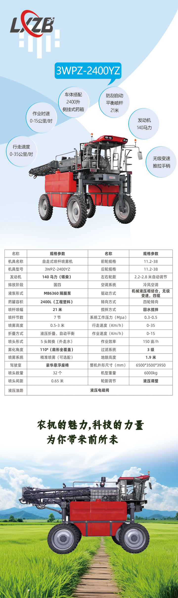 3WPZ-2400YZ是我公司生產的2400系列的高配車型,2400系列已經生產銷售10余年;技術成熟可靠。行走速度根據不同路況可以達到0-35KM/H;作業(yè)速度根據作業(yè)環(huán)境可以達到0-15KM/H。3WPZ-2400YZ搭配2400升側掛式藥箱。21米防刮自動平衡噴桿。五頭轉換美國噴頭。此機型采用錫柴國四排放標準140馬力發(fā)動機。MB6360隔膜泵,機械液壓相結合的傳動方式。機械液壓相結合的傳動方式是立興打藥機的獨有技術,已經在10余種機型,2000多臺機器上配套使用,技術成熟可靠。