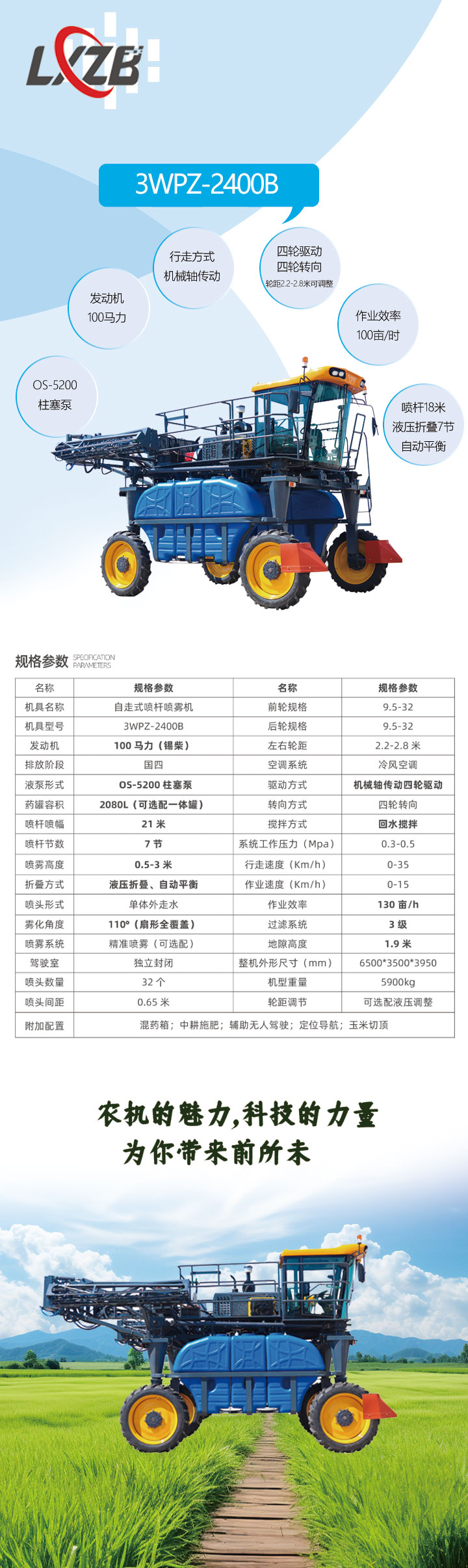 3WPZ-2400B自走式噴桿噴霧機(jī)是一種集噴藥,切頂,施肥等功能于一體的噴藥設(shè)備此機(jī)型采用錫柴國四排放標(biāo)準(zhǔn)發(fā)動(dòng)機(jī)100馬力,配備全封閉獨(dú)立駕駛室,0S-5200柱塞泵,4+1共五個(gè)擋位4個(gè)前進(jìn)擋位一個(gè)后退擋位。該機(jī)型行走方式采用機(jī)械軸傳動(dòng)這款傳動(dòng)方式在泥濘道路中驅(qū)動(dòng)力強(qiáng),脫因能力強(qiáng),輪距2米-2.6米可調(diào)節(jié)(可選配液調(diào)節(jié)輪距》四輪驅(qū)動(dòng)四輪轉(zhuǎn)向,輪距可調(diào)整,設(shè)計(jì)結(jié)構(gòu)合理,維修便捷,作業(yè)質(zhì)量好,作業(yè)效率可達(dá)每小時(shí)120畝。各性能指標(biāo)均超過國家有關(guān)標(biāo)準(zhǔn)要求。