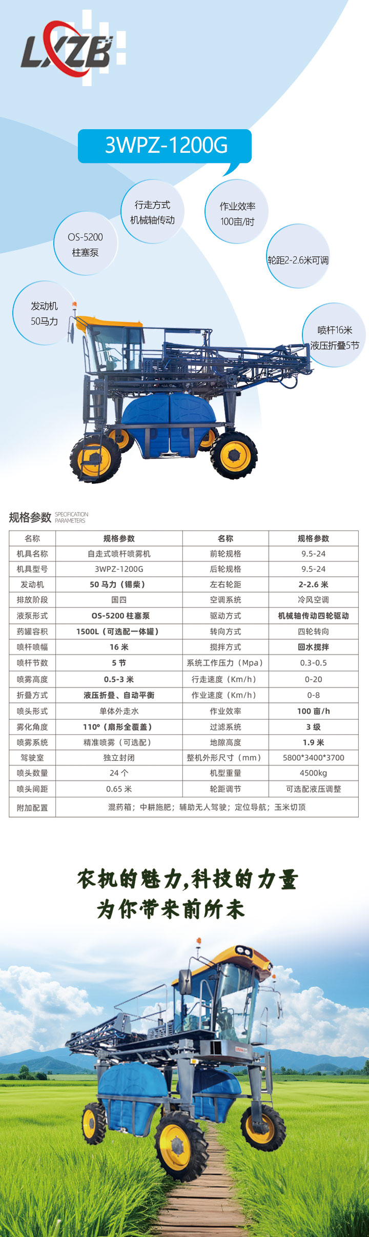 3WPZ-1200G自走式噴桿噴零機(jī)是一種集噴藥,切頂,施肥等功能于一體的噴藥設(shè)備此機(jī)型采用錫柴國四排放標(biāo)準(zhǔn)發(fā)動機(jī)50馬力,配備全封閉獨(dú)立駕駛室,05-5200柱塞泵,4+1共五個擋位4個前進(jìn)擋位一個后退擋位。該機(jī)型行走方式采用機(jī)械軸傳動這款傳動方式在泥濘道路中驅(qū)動力強(qiáng),脫因能力強(qiáng),輪距2米-2.6米可調(diào)節(jié)(可選配液調(diào)節(jié)輪距)四輪驅(qū)動四輪轉(zhuǎn)向,輪距可調(diào)整,設(shè)計結(jié)構(gòu)合理,維修便捷,作業(yè)質(zhì)量好,作業(yè)效率可達(dá)每小時100畝。各項性能指標(biāo)均超過國家有關(guān)標(biāo)準(zhǔn)要求。