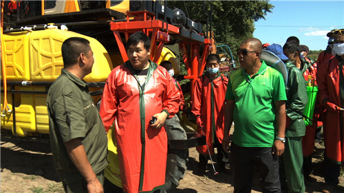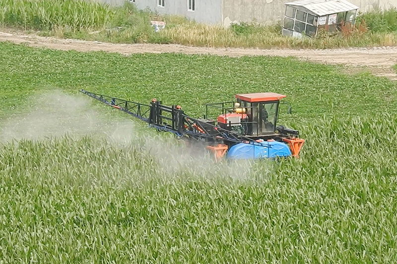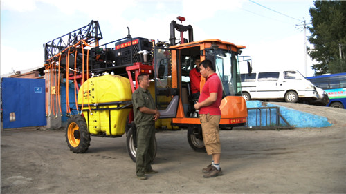 根據(jù)夏師傅的介紹,這臺噴藥機可以在高桿作物農田里行進噴藥,它尾部的噴桿可以調整高度,高可以到達2.5米,而噴桿噴出的農藥會形成水霧,均勻地噴灑在葉片上,達到驅逐害蟲的效果。